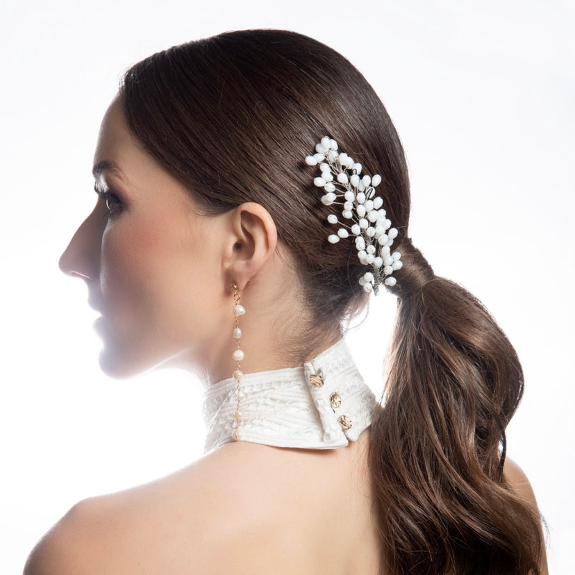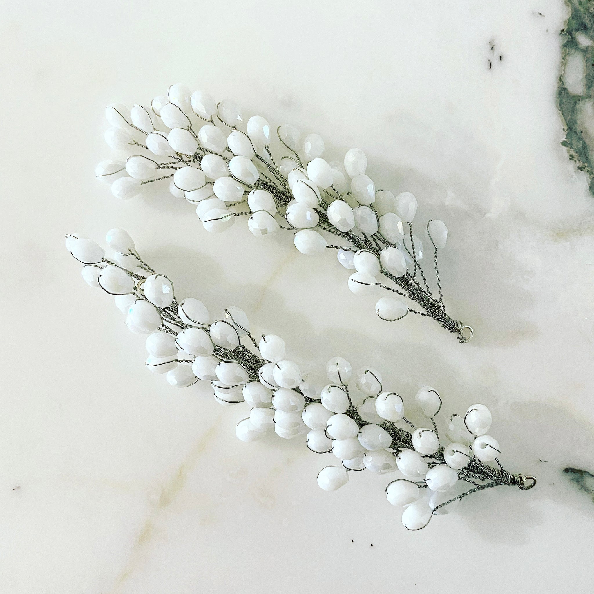 Set de 2 piezas de gota de cristal checo en color blanco y en almbre plateado.